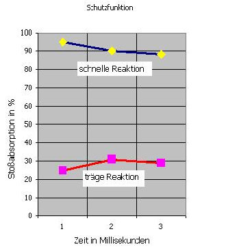 Die nebenstehende Tabelle vermittelt deutlich die erheblichen Unterschiede der Schutzfunktion, die bei Sportböden in Turnhallen und Sporthallen bestehen können. Schnelle Böden bauen bereits innerhalb von nur 1 Millisekunde !!! fast 100% der gefährlichen Stoßkräfte, wie sie zum Beispiel beim Belaufen, Springen oder bei Stürzen auftreten, ab.