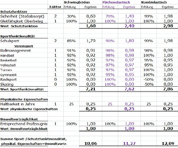 Die nachstehende Tabelle kann Ihnen bei der Sportboden-Entscheidung für Ihre Turnhalle und Sporthalle eine wertvolle Hilfe sein. Wir haben aus den Prüfzeugnissen für die unterschiedlichen Sportboden - Arten die darin ausgewiesenen Werte ermittelt. Diese Werte haben wir in der Tabelle in Bezug auf die dualen Erfüllungen der jeweiligen Anforderung dargestellt. In unserem unverbindlichen Beispiel weist der Kombiniert Elastische Sportboden mit 12,09 die besten Leistungswerte auf.