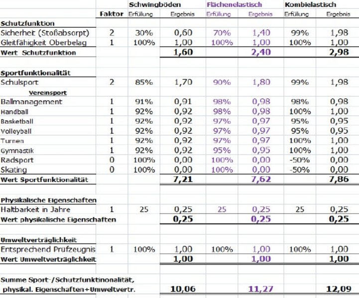 Empfehlung: Lassen Sie sich von uns kostenlos und unverbindlich, mit Ihren Anforderungen versehen, eine individuelle Leistungsbilanz für Ihre Sportboden-Entscheidung erstellen.